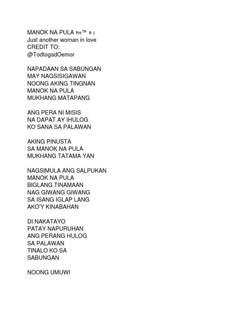 Choose one of the browsed Manok Na Pula Tagalog Version With Lyrics lyrics get the lyrics and watch the video. Just walking by in the cockpit Someones shouting When i was looking The red chicken Looks so brave My wifes money That i would.