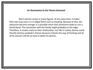 Its protagonist was a sabungero or cock fighter who developed an addiction to cockfighting. He wants to prove that his dreams are true even it is not. The story is about the protagonist who is addicted to cock-fighting.