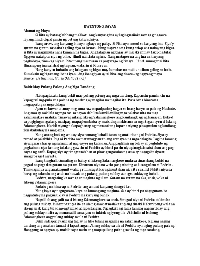 Up to 24 cash back Ang mga kuwentong-bayan ay likha lamang ng guni-guni at walng katotohanan. Ayon sa kuwento may mag-ama raw napadpad ng bagyo sa isang baryo sa pulo ng Masbate. Karaniwang kaugnay ang kwentong-bayan ng isang tiyak na pook o rehiyon ng isang bansa o lupain.