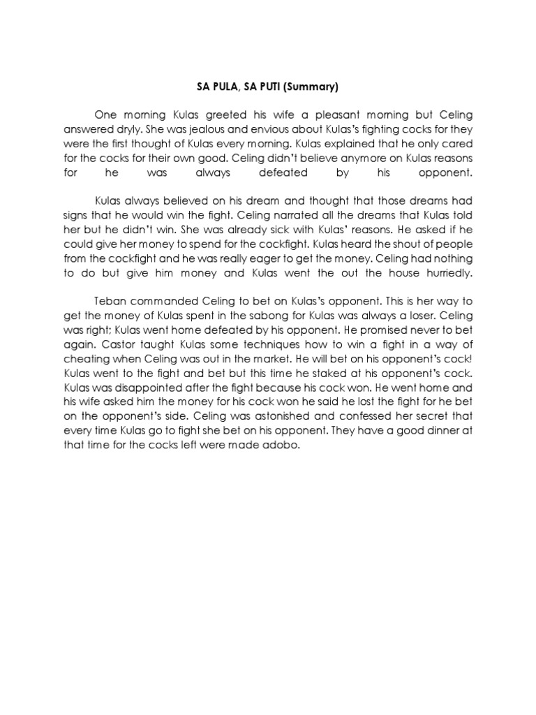 Sa Pula Sa Puti is a play that has a single act and weaves the story in and out of this lone act. Bitaw o labanan ng mga manok 2. Share your aftermath realizations.